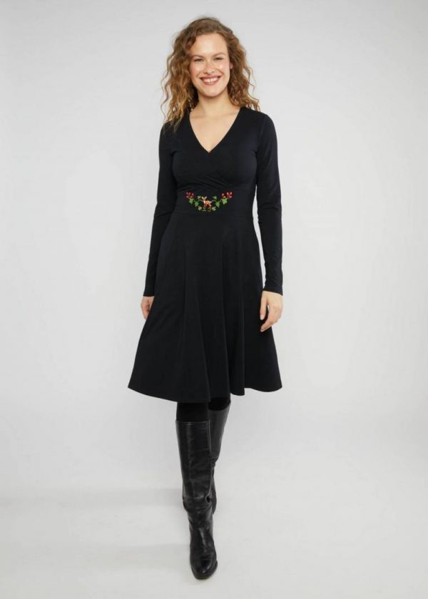 Artikelnummer: 001243-220-1231-MHauptstoff:Baumwolle (Bio) 95%, Elasthan 5%aus anschmiegsamem Bio-Baumwoll-JerseyLänge: knielangV-Ausschnitt in Wickeloptikbreiter, gemütlicher Taillenbundweit schwingender Rockteilabgesteppte Falten im OberteilKokosnuss-Knopf zur Anpassung der Ausschnitttiefeschwarze Uni-Variante mit aufwendigem Multicolour-Stick
