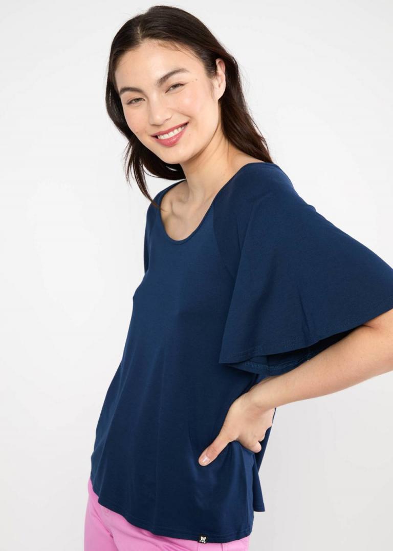 Artikelnummer: 001251-233-01496-MHauptstoff:Viskose (LENZING ECOVERO) 95%, Elasthan 5%aus weichem Viskose-JerseyoversizedLänge: Halbarmalltagstauglicher Rundhalsausschnittraffiniertes Rücken-Dekolleté weit geschnittene Fledermausärmel