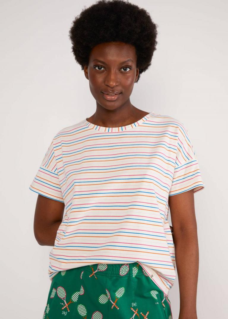 Artikelnummer: 001241-134-0993-LHauptstoff:Baumwolle (Bio) 95%, Elasthan 5%aus anschmiegsamem Bio-Baumwoll-JerseyoversizedÄrmel: Kurzarmunkomplizierter Rundhalsausschnitt mit schmaler Blendeleicht überschnittene Schulternkombinationsfreudiges Streifen-Design in zeitlosen Farben